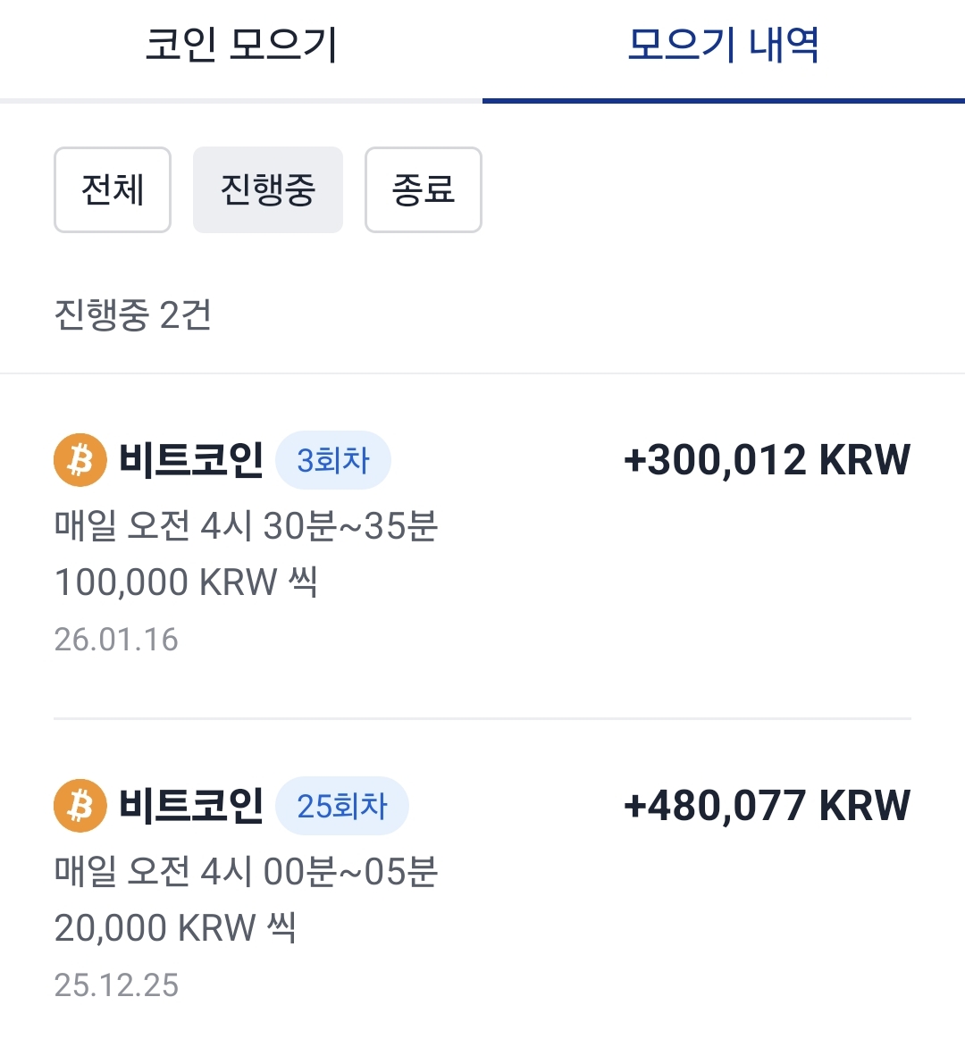 나는 업비트 코인모으기를 통해 비트코인 매수중이다.